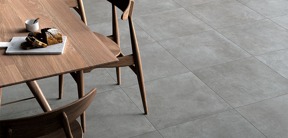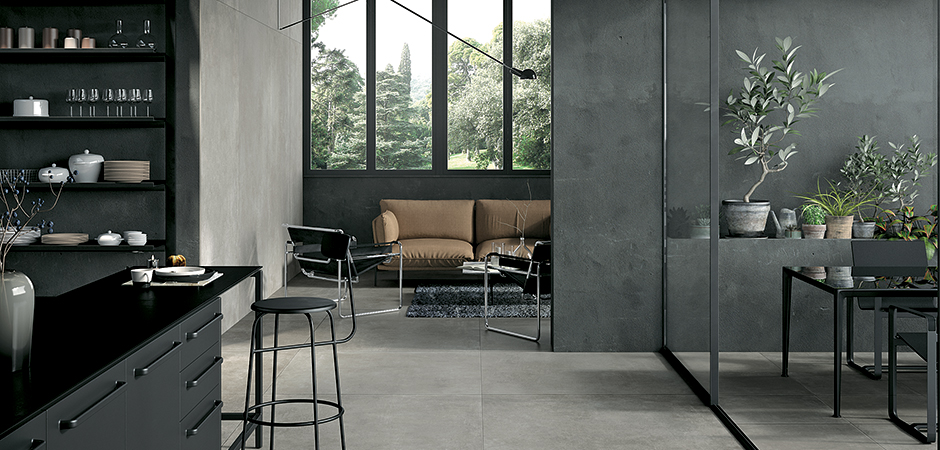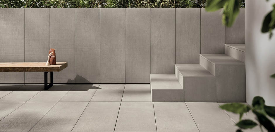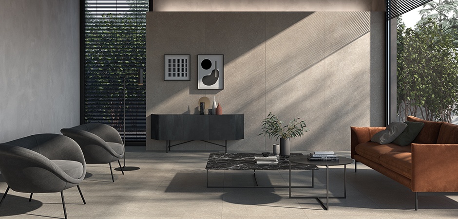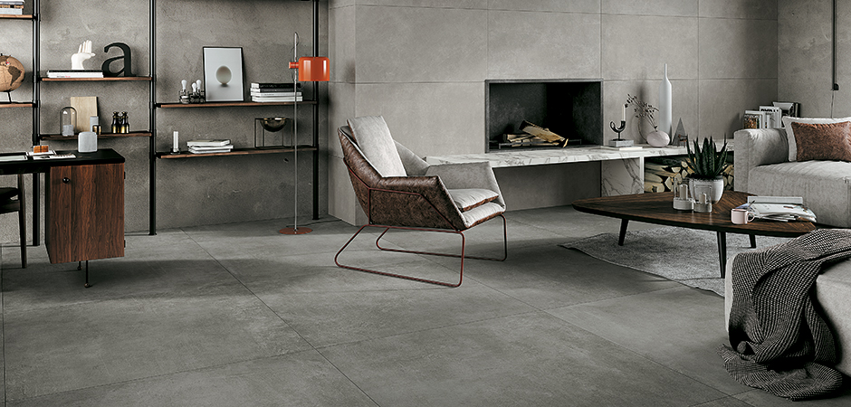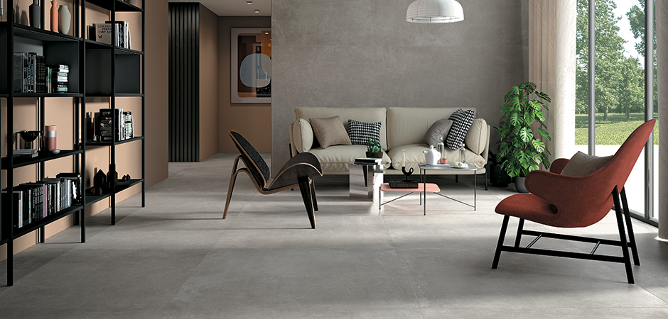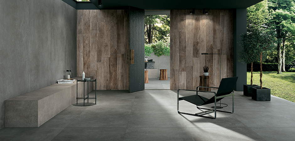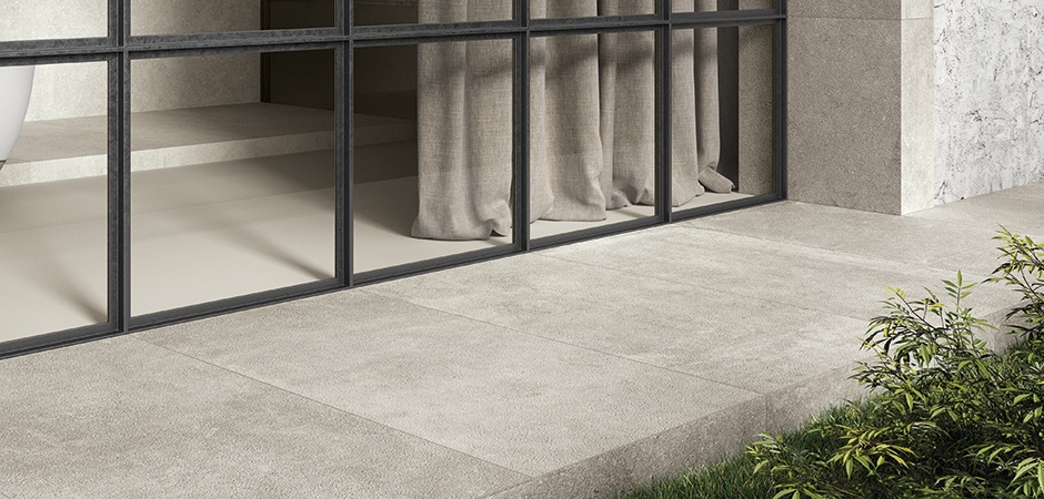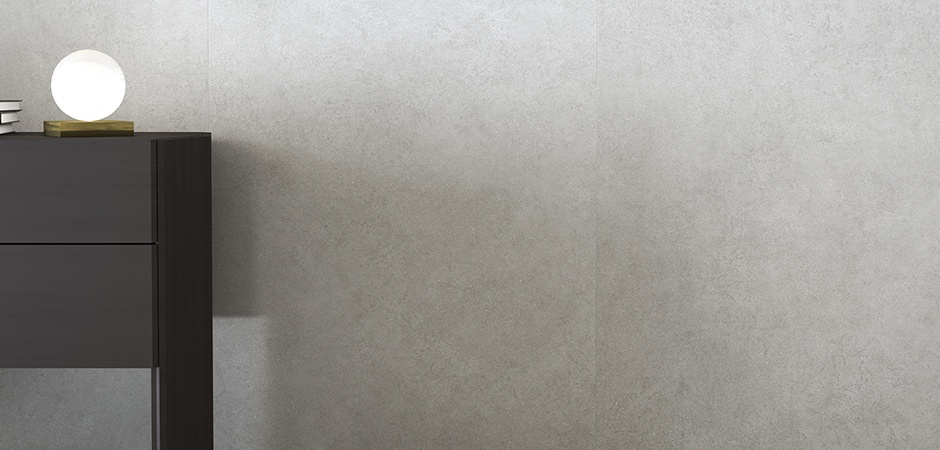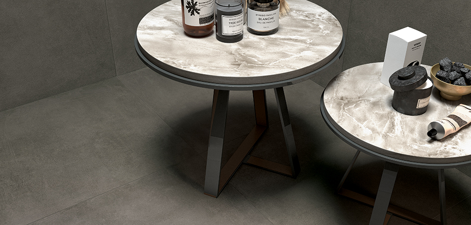 CONCRETE présente toute la richesse du ciment poli, avec les caractéristiques techniques et le haut rendement du grès cérame pleine masse.