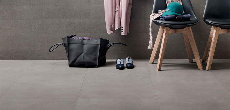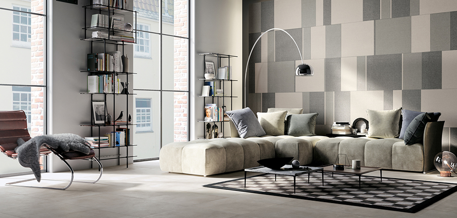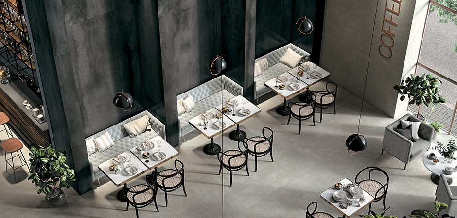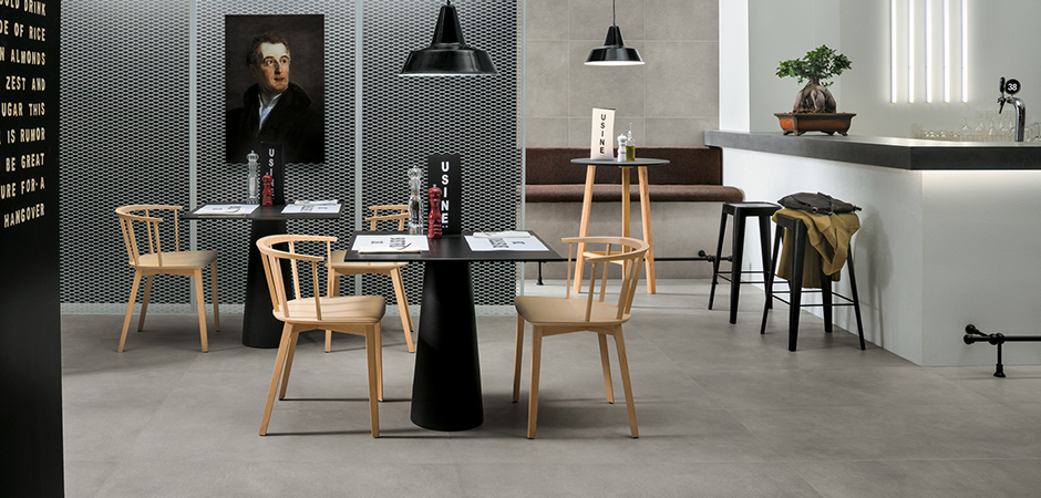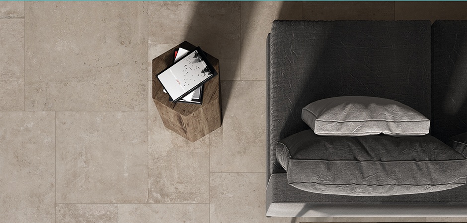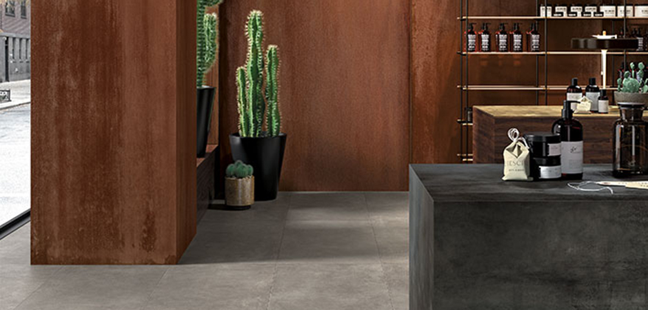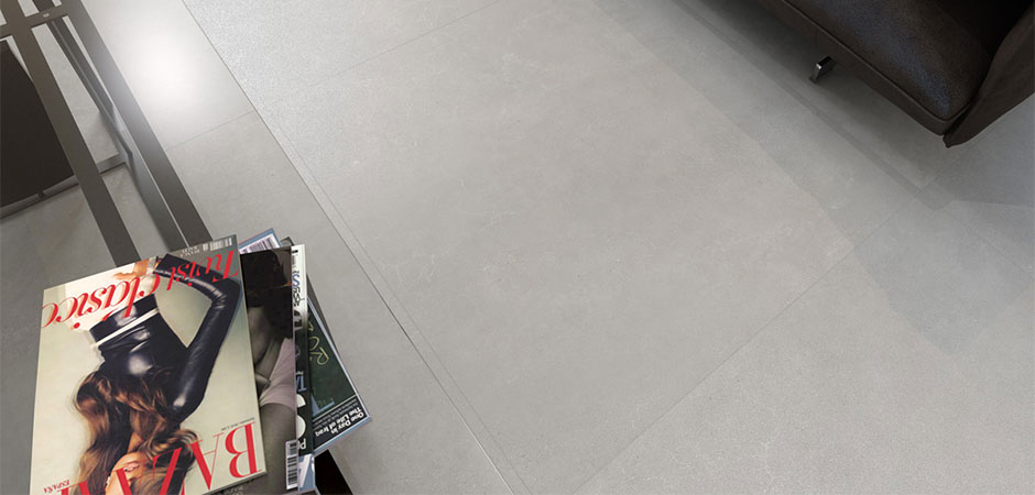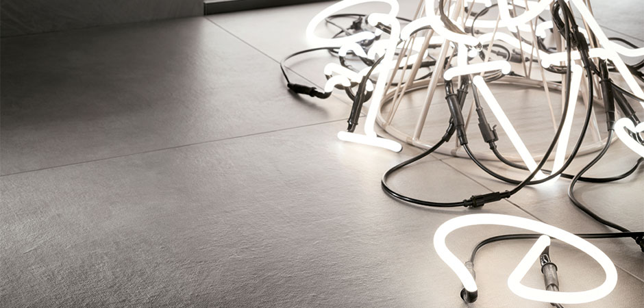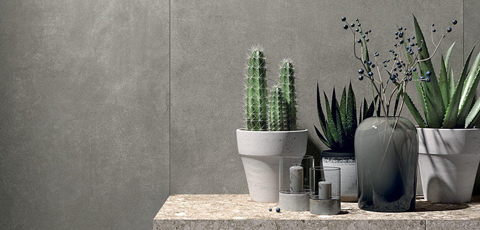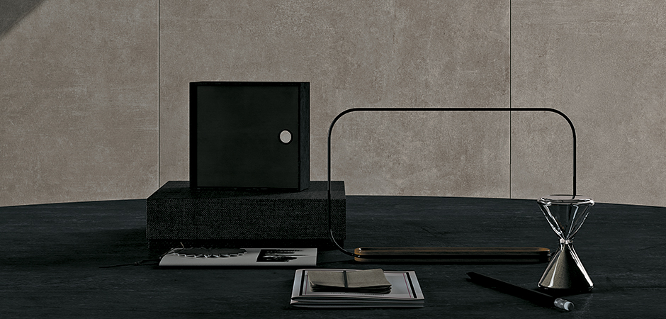 CONCRETE présente toute la richesse du ciment poli, avec les caractéristiques techniques et le haut rendement du grès cérame pleine masse.